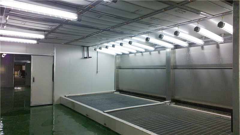噴漆時,外部空氣經過初級過濾網后由風機送到房頂,再經過頂部過濾網二次過濾凈化后進入房內,房內空氣采用全降式,以0 2-0 3m s的速度向下